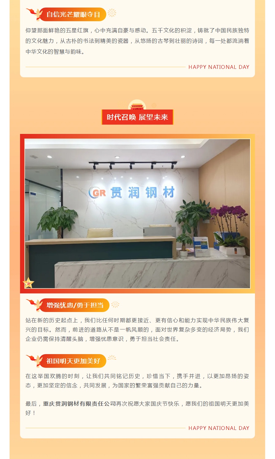 喜迎國(guó)慶,盛世華誕——貫潤(rùn)鋼材祝福祖國(guó)繁榮昌盛。眾生?;劬d長(zhǎng)!