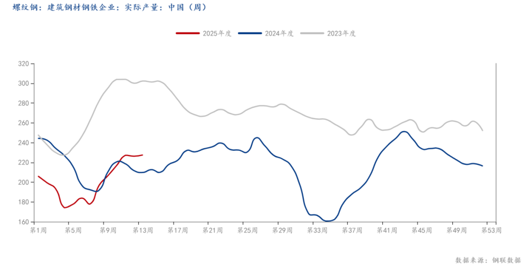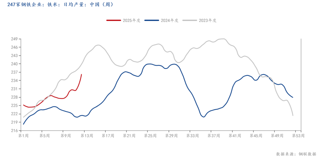 如圖所示,我網(wǎng)對47港口庫存進行調(diào)研,本期47港口鐵礦庫存周環(huán)比小幅增加,且?guī)齑嫠教幱谙鄬Ω呶?。從需求端看,鐵水產(chǎn)量亦呈現(xiàn)增勢,截止發(fā)稿,全國247家樣本鋼廠的日均鐵水產(chǎn)量為237.28萬噸,環(huán)比上周增加1.02萬噸,鋼廠仍處于增產(chǎn)階段。數(shù)據(jù)表明,鐵水產(chǎn)量自2025年2月底以來持續(xù)呈現(xiàn)回升態(tài)勢,且增速顯著加快,而當前鐵水產(chǎn)量處于加速復(fù)蘇通道,全國鐵水日均產(chǎn)量同比增幅顯著,且鋼廠盈利率與高爐開工率同步改善。短期內(nèi),需求回暖與利潤修復(fù)仍是核心驅(qū)動,而隨著成材端社會庫存逐步去化,預(yù)計短期內(nèi)鐵水產(chǎn)量或維持增勢,但整體產(chǎn)量增幅或有所放緩。